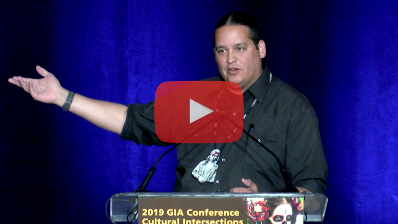 Gregg Deal (Pyramid Lake Paiute Tribe) is a provocative contemporary artist who challenges Western perceptions of Indigenous people, touching on issues of race, history, and stereotypes. Through his art, Deal critically examines issues and tells stories of decolonization and appropriation that affect Indian country. He explored those topics at his keynote during the Tuesday Luncheon Plenary of the 2019 GIA Conference. Tariana Navas-Nieves of Denver Arts & Venues introduced him.